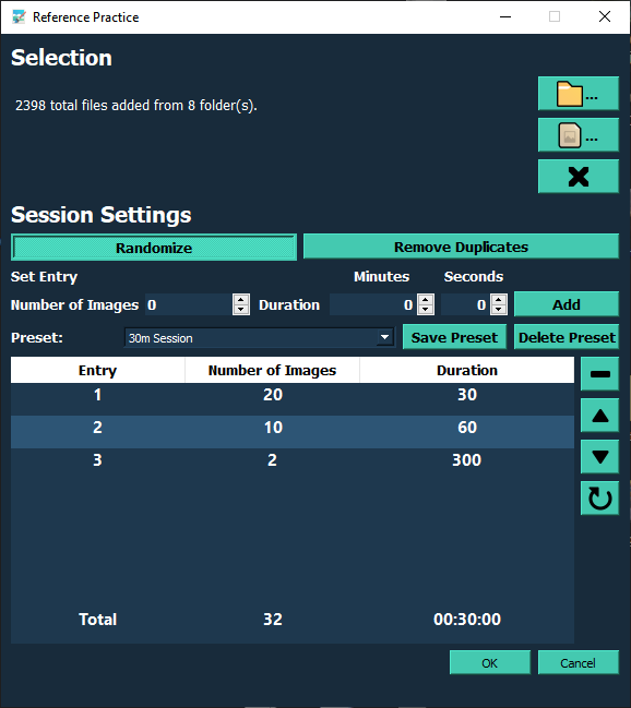 GestureSesh allows you to choose from your own reference images and set custom intervals for your practice sessions. Your recent settings are automatically saved, and you can save your settings as presets to quickly load them later.